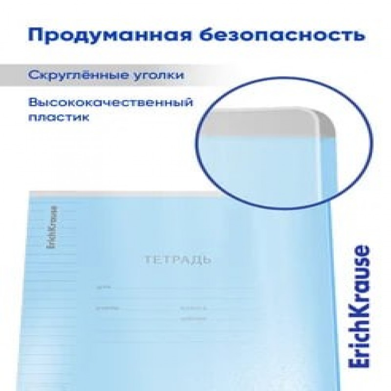 | Особенности тетради | прозрачная пластиковая обложка; закругленные углы обложки и блока; плотность листов 60 г/м2; Белая бумага; синяя линовка; поля |